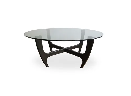 This coffee table features a dowel joined, steel reinforced, solid 6/4 hardwood base with felt feet and synthetic glass bumpers. Resting on the base is a 40" diameter, 1/2" thick tempered glass top.