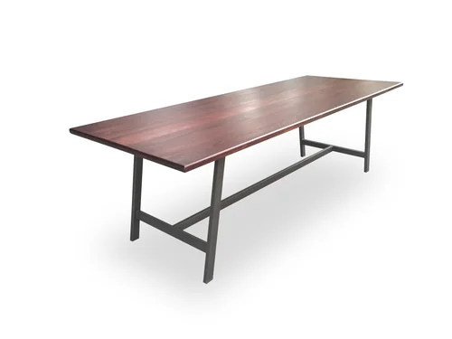 A solid 6/4 Hardwood Top stained in Georgian Cherry mounted to a welded steel base with a 10 degree splay. Ideal for use as a dining table or a small conference table. Comfortably seats 10.
