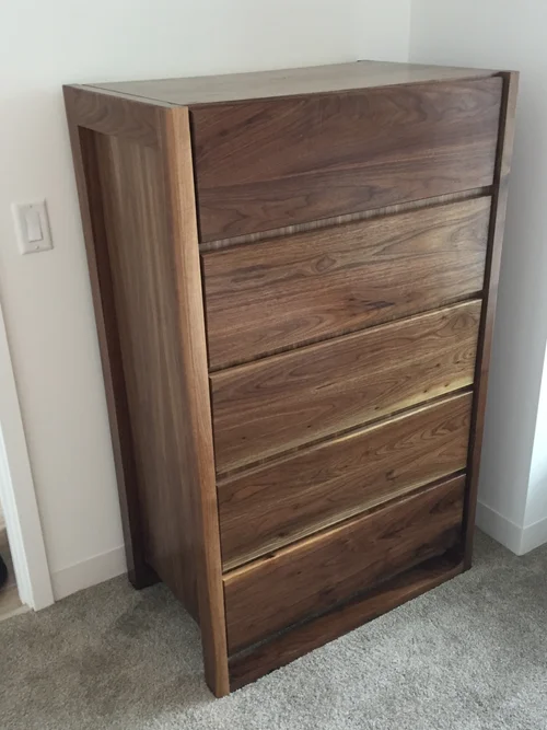 This mid century inspired, American walnut end table features solid hardwood construction. A continuous grain pattern wraps the drawer box and a solid bronze pull completes the drawer.