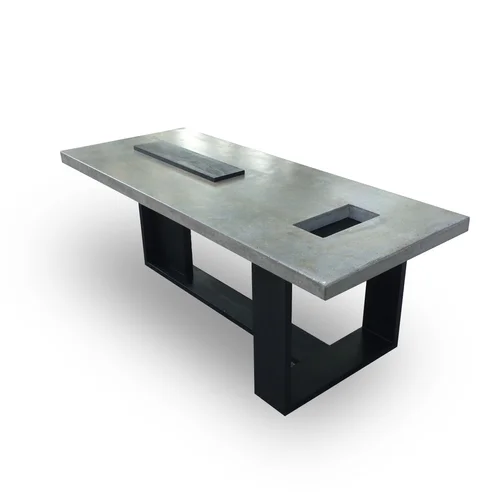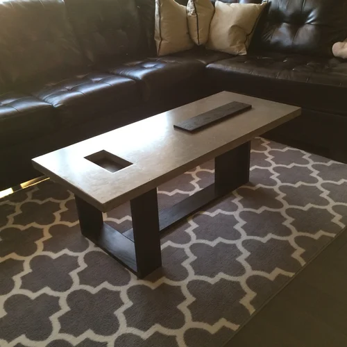 A coffee table in cast concrete and steel reinforced hardwood. A slight void in the top was designed to fit a set of coasters.