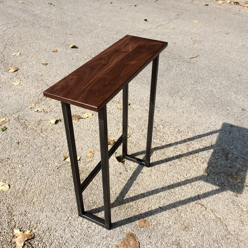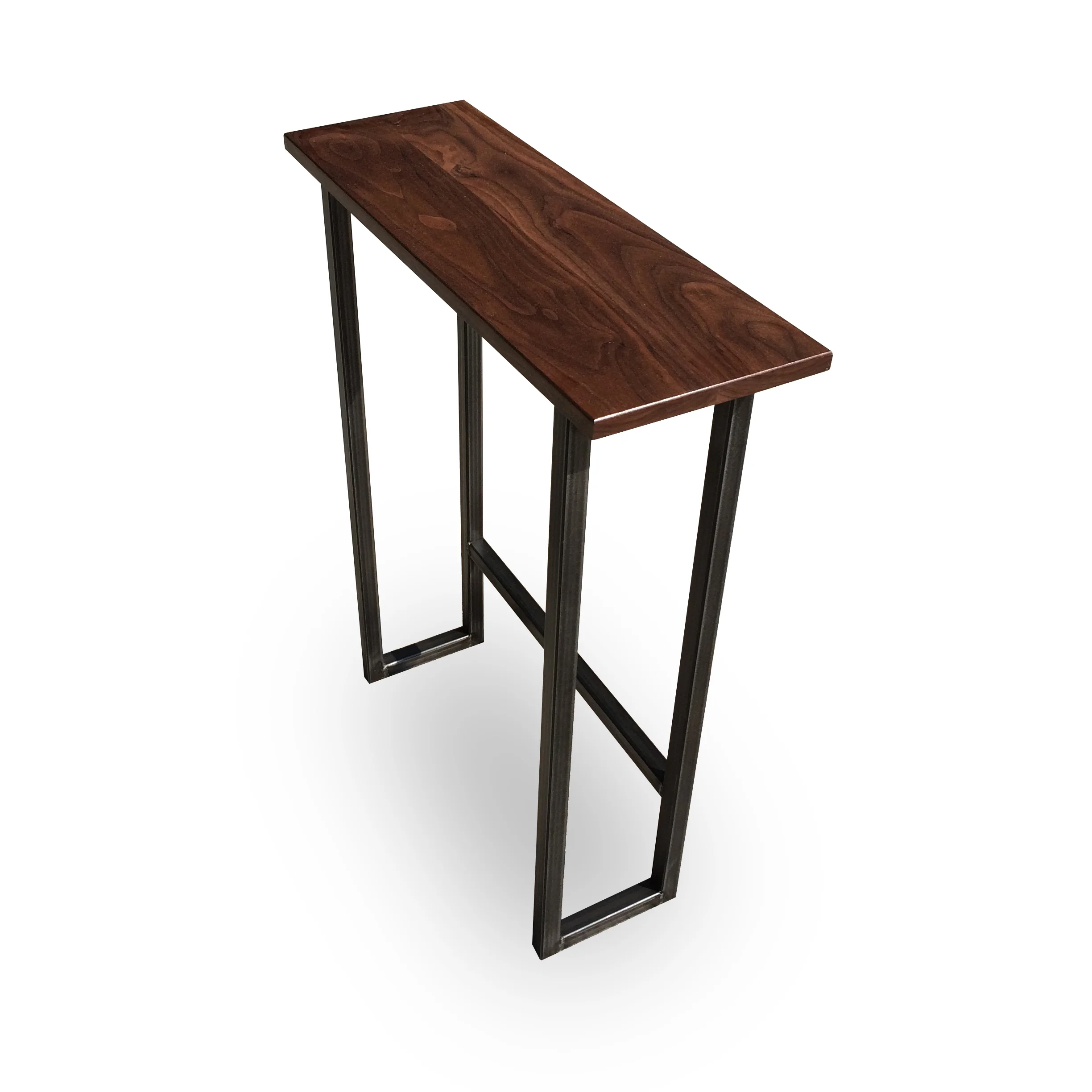 The slim profile of the Adrienne makes it ideal as an entryway table or hallway console. An oiled, solid american black walnut top rests on a clear-coated raw steel base.