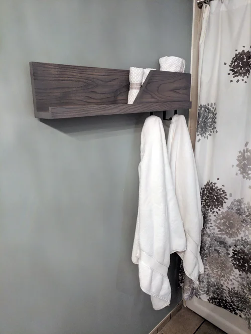 This custom designed shelf features grey stained ash hardwood and hand bent 1/8" steel towel hooks.