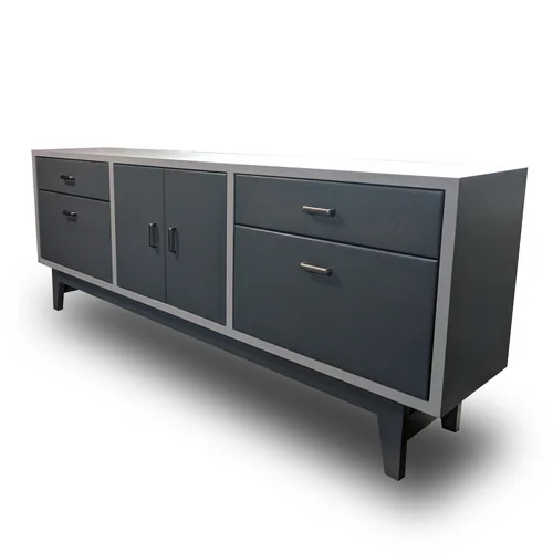 A 6’ long monochromatic file storage credenza in solid ash with a painted medium density fiberboard body